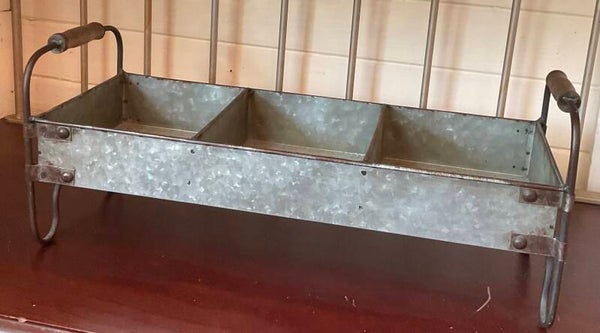 Three separate compartments, Wooden handles. 7 inches height 18inches length 7 1/2 inches wide