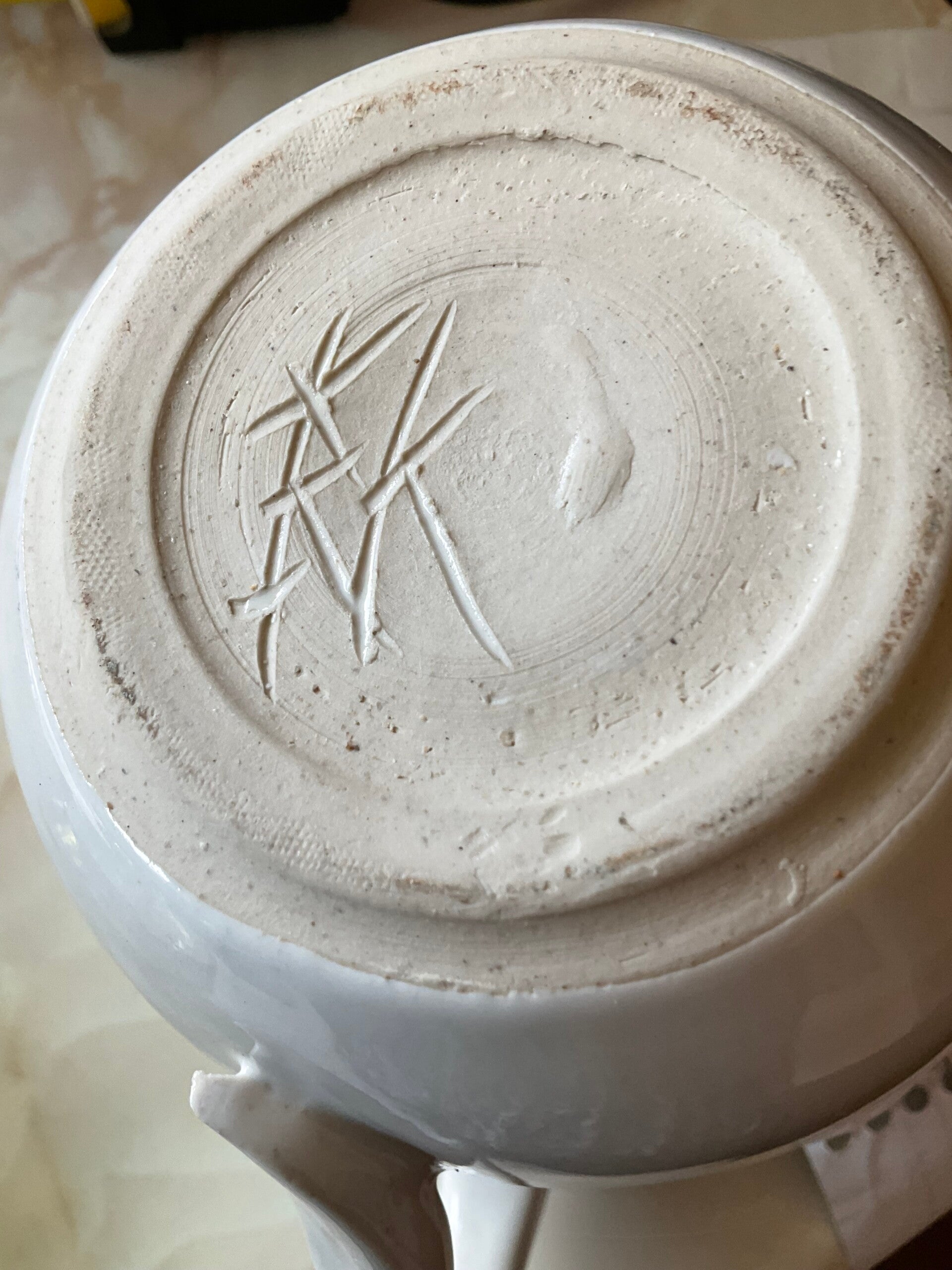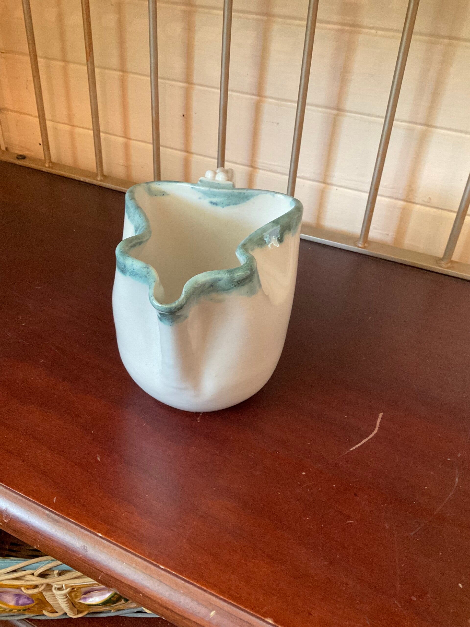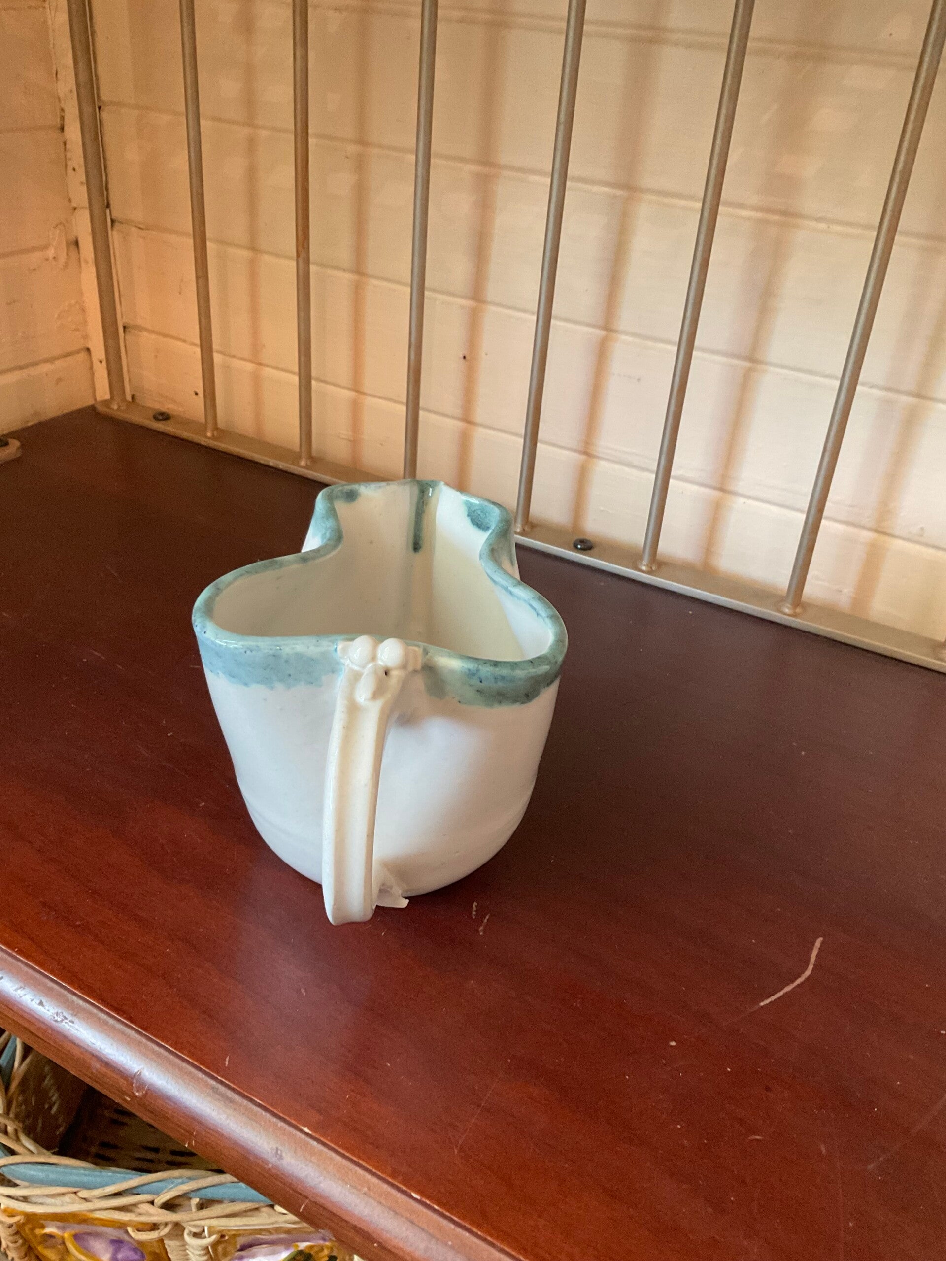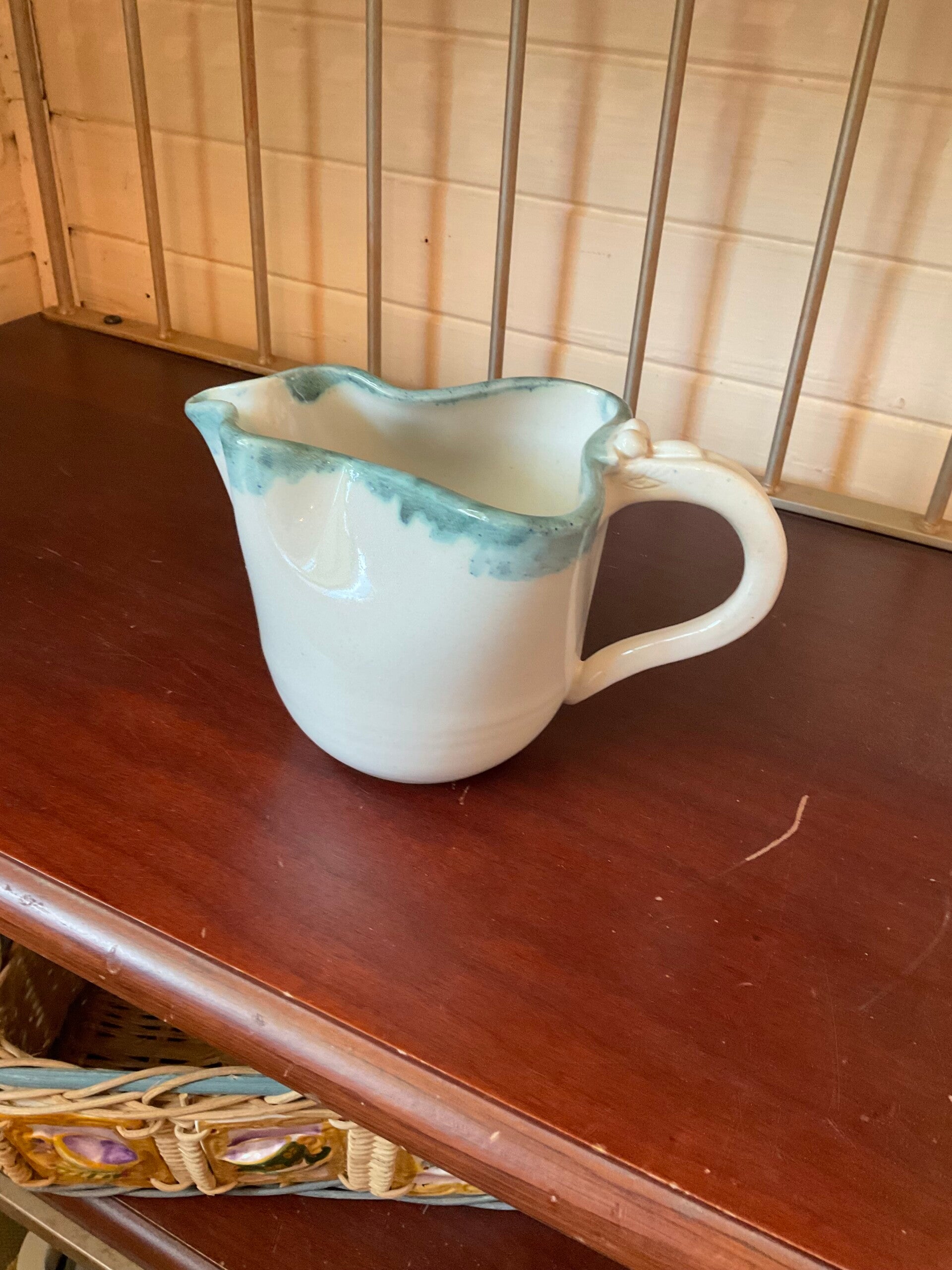 Warm cream color, New ,edged with a light blue around the opening. Has a detailed handle. The length is 6 inches,height 6inches handle 3 1/2 inches, base 3 1/2 inches.