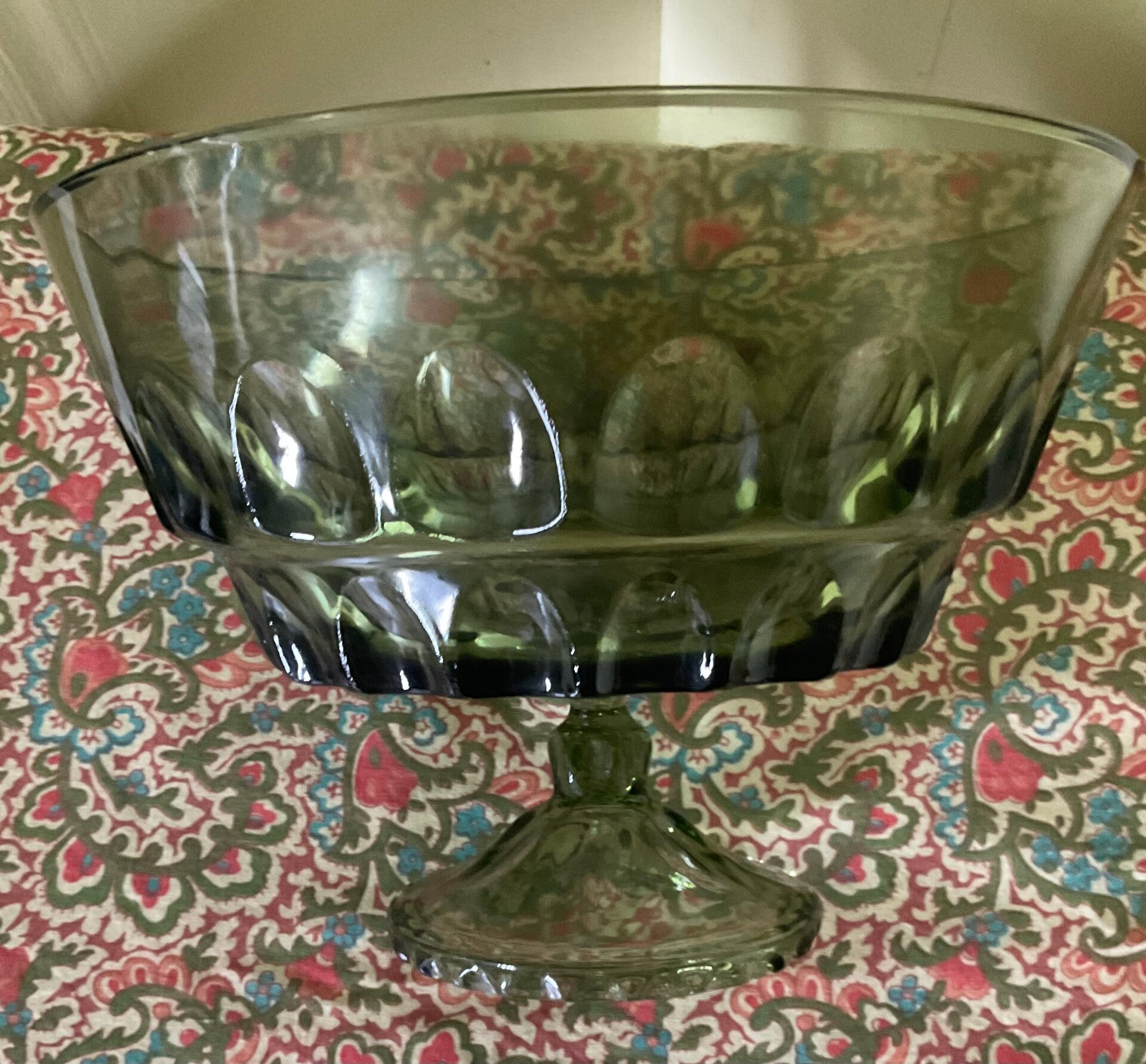 Transparent green. 10 inches round 4 inches deep 8 1/2 inches height.