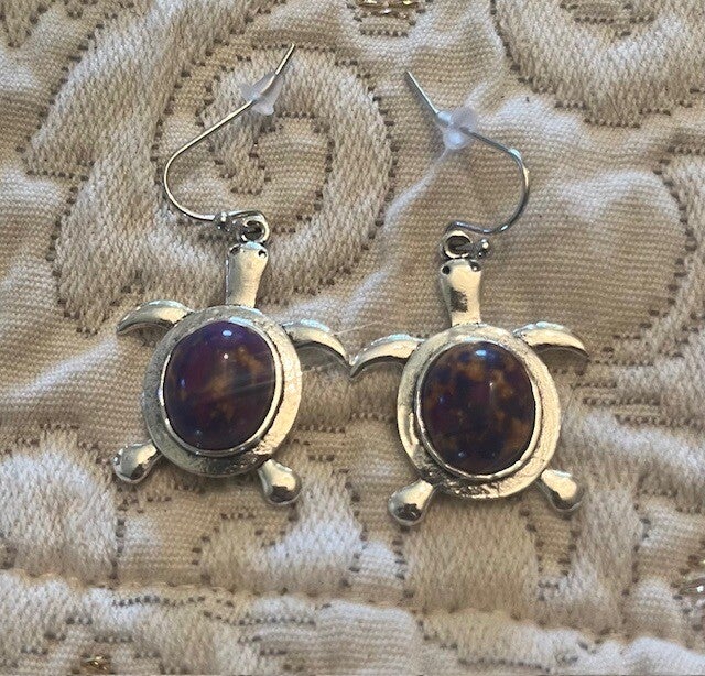 Petite turtle earrings 1 inch length silver with brown stone insert