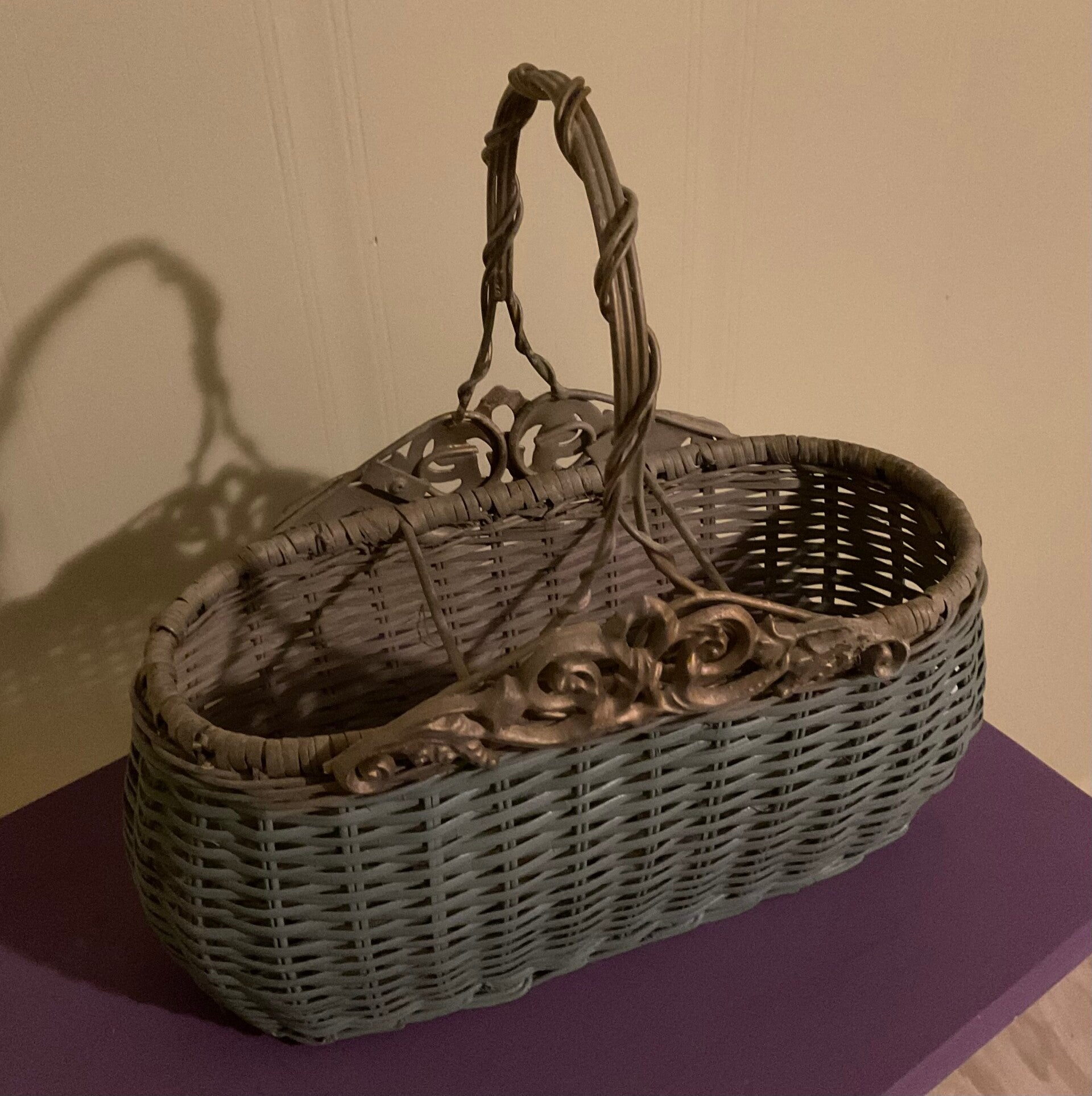 Light blue and beige woven wicker basket with decorative floral accents/ Possible wine basket.